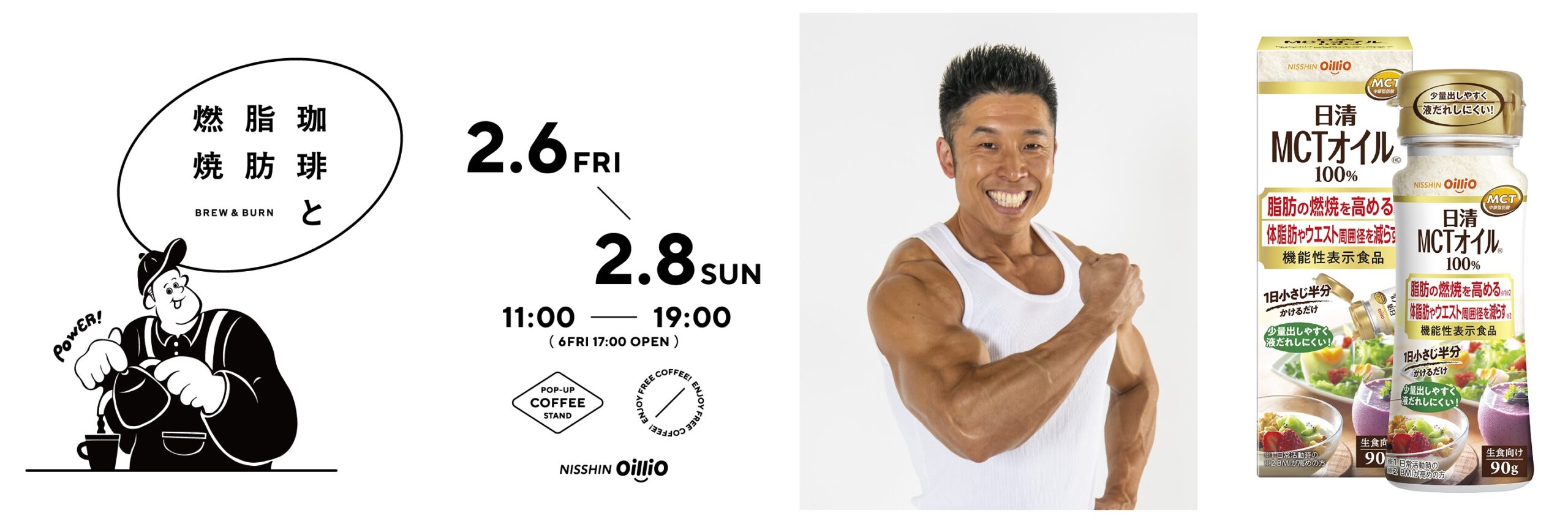 日清オイリオグループは1月22日、なかやまきんに君を「日清MCTオイルHC」のブランドアンバサダーに起用したと発表した。これを記念し、2月6日(金)から8日(日)までの3日間、東京・表参道で体験型カフェ「珈琲と脂肪燃焼 by NISSHIN OilliO」を期間限定で開催する。
