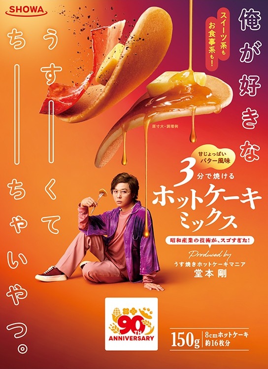 昭和産業株式会社は、創立90周年を記念し、新商品『俺が好きなうすーくてちーちゃいやつ。ホットケーキミックス』を2026年3月1日(日)に全国で発売する。プロデュースを手がけたのは、ホットケーキ愛で知られるアーティストの堂本剛。これまでにない“うすくて小さい”設計で、新たな食シーンを提案する。