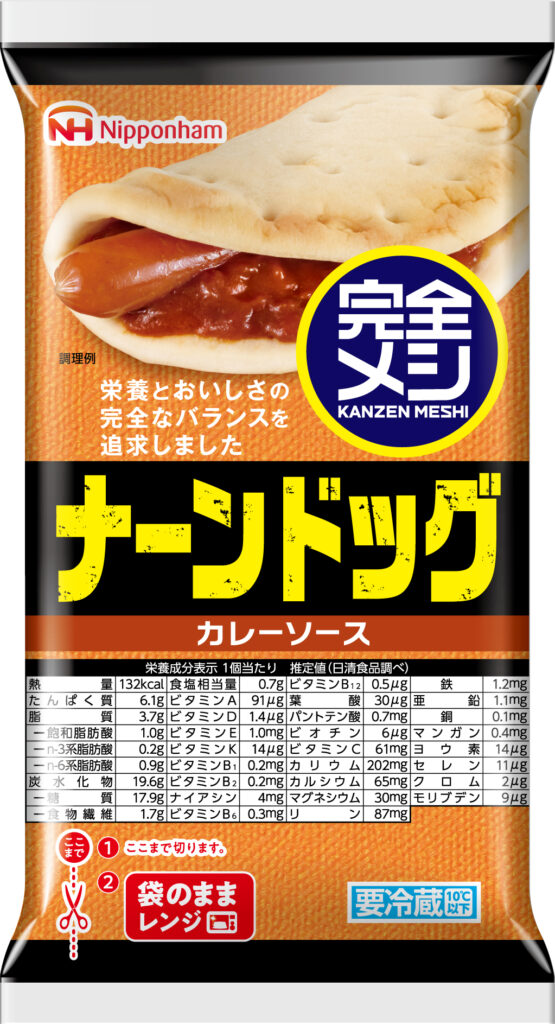 日清食品が展開する「完全メシ」は、厚生労働省の「日本人の食事摂取基準」で設定されたビタミン・ミネラルなど33 種類の栄養素と、おいしさの完全なバランスを追求したブランド。今回、日本ハムが国内食肉業界売上No.1 メーカーとして「完全メシ」とコラボレーションし、ジューシーなソーセージ入りの満足感溢れる「ナーンドッグ」を実現した。ふっくらもちもち食感のナーンが、肉々しいジューシーなソーセージとスパイス香る特製カレーソースを包み込んでいる。電子レンジで30 秒の簡単調理、持ち運びしやすいワンハンド仕様で、場所やシーンを選ばず豊かな食事体験を提供する。1個あたり132kcal でありながら食べ応え十分。