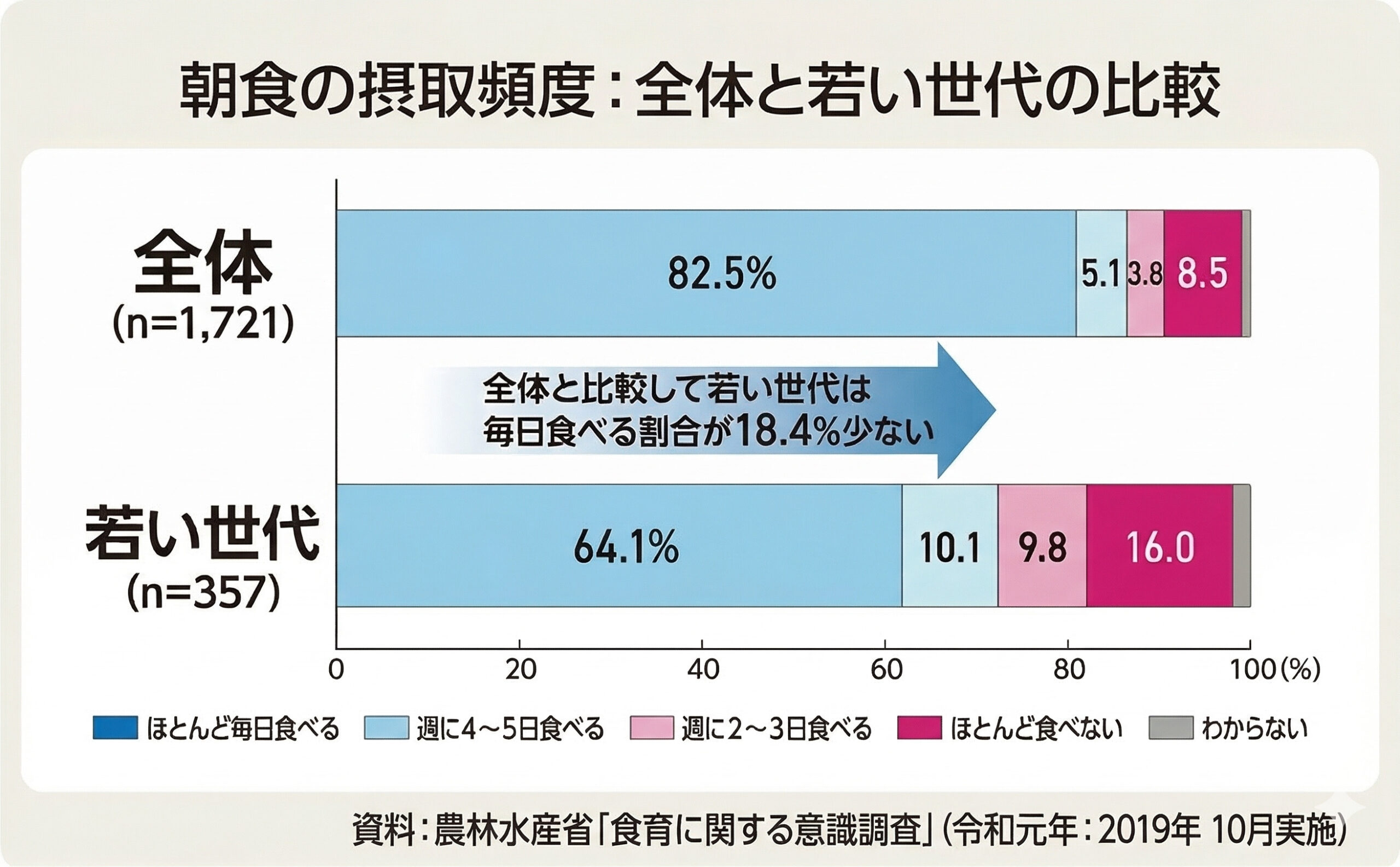 農林水産省の調査によると、若い世代の朝食欠食率は25.8%に上る。特に男性では31.5%が朝食を欠食し、「ほとんど食べない」は21.0%と、5人に1人に達する。一方で「ほとんど毎日食べる」割合は他世代より18.4%低く、生活習慣の課題が浮き彫りとなっている。