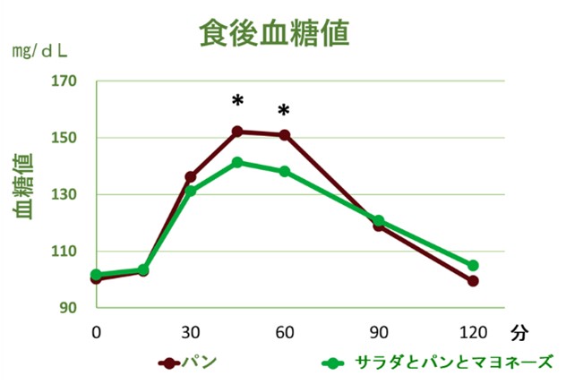 健常成人男性15人を対象とした試験では、食パン(70g)のみを摂取した場合と比べ、食パンにミックスサラダ(65g)とマヨネーズ(15g)を加えた場合、血糖値の上昇が有意に抑制された。