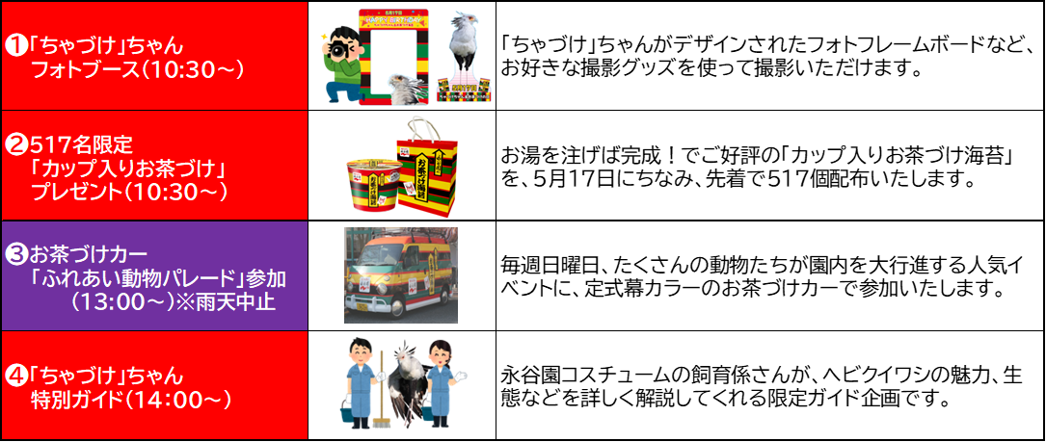 永谷園は、5月17日の「お茶漬けの日」に、東武動物公園とのコラボイベント「お茶漬けの日~ヘビクイワシ・ちゃづけ5歳誕生日イベント」を開催する。